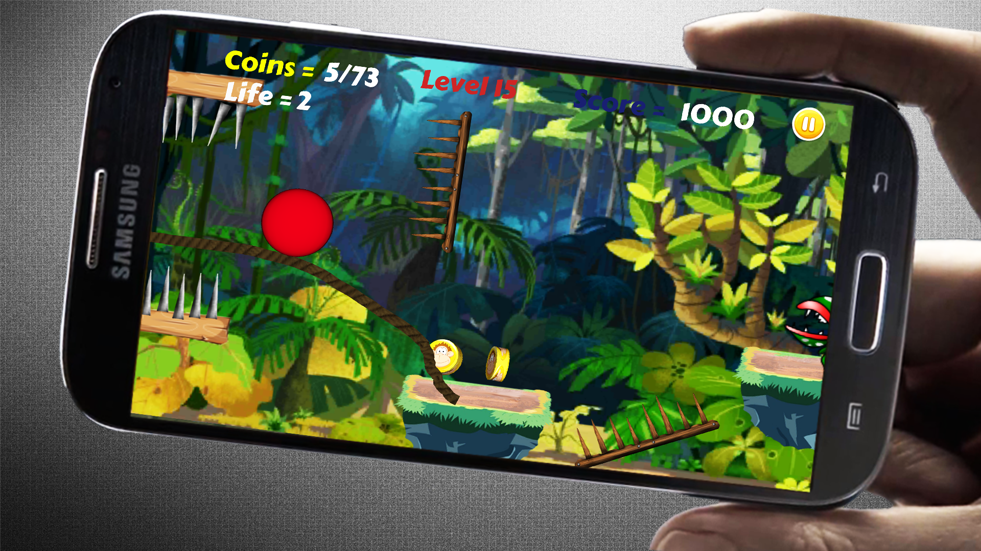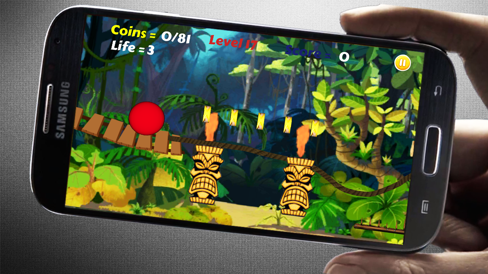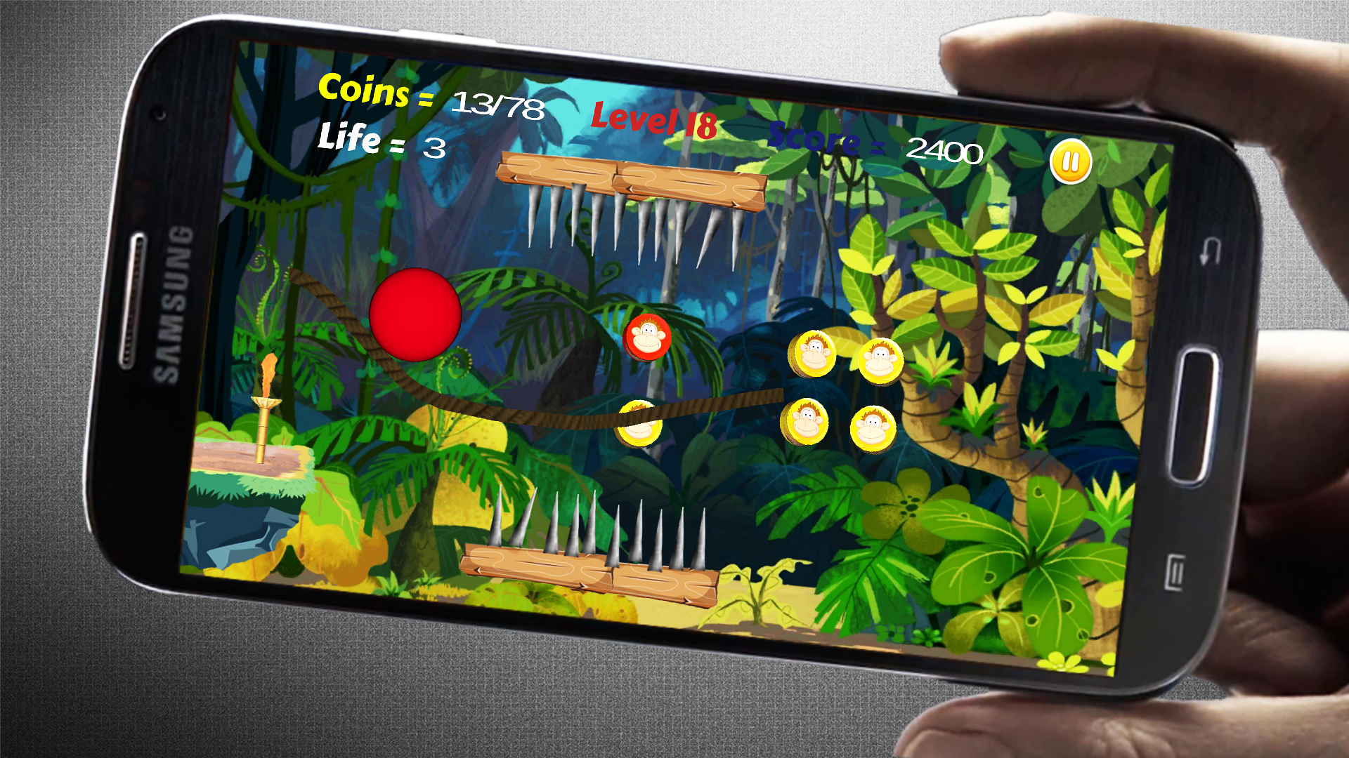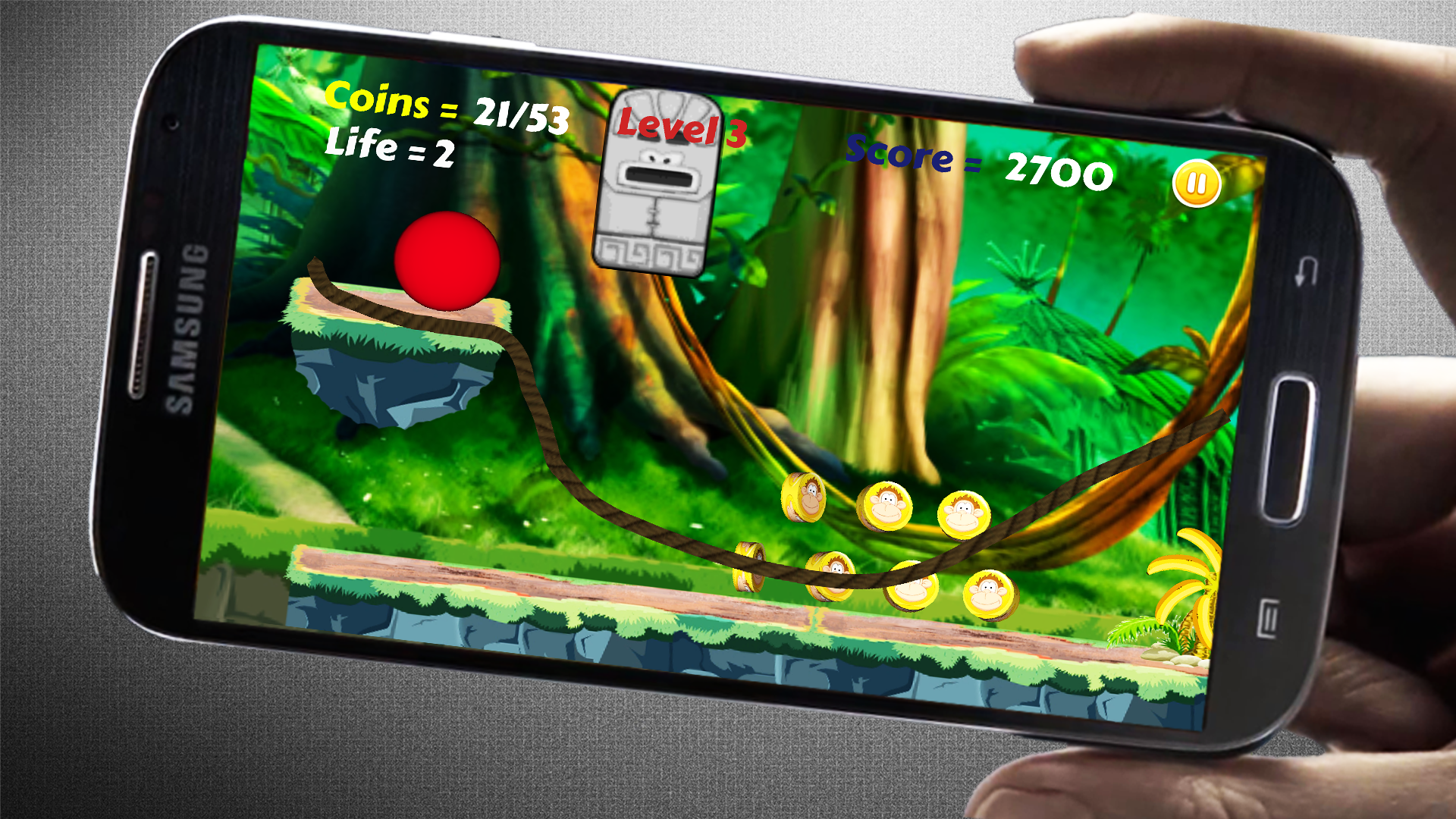Mickey the Monkey has gotten his favorite little red ball taken away by the bullies of the jungle... the evil floating Tiki Heads! Help Mickey get his ball back! Play by tilting your device and drawing ropes "bridge lines" to navigate the ball to freedom. Simply draw lines with your finger, and use physics by tilting your device. You will be the one to determine the course the ball takes and the speed it travels through the jungle. Sound easy? Think again! Master this challenging and addictive concept of tilting and drawing while not perishing from the tricky obstacles such as floating tiki heads, protruding spikes, man-eating plants, as well as not allowing the ball to drop into an abyss. Collect every coin and gain access to all the power-ups such as the tiny jungle ball or feather weight jungle ball to enhance the jungle adventure. Can you help Mickey get his ball back?!
