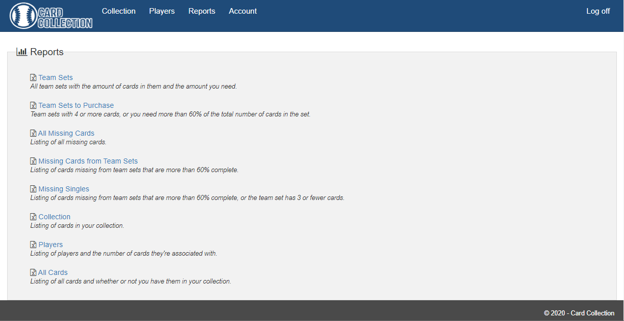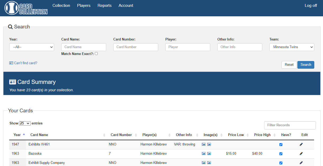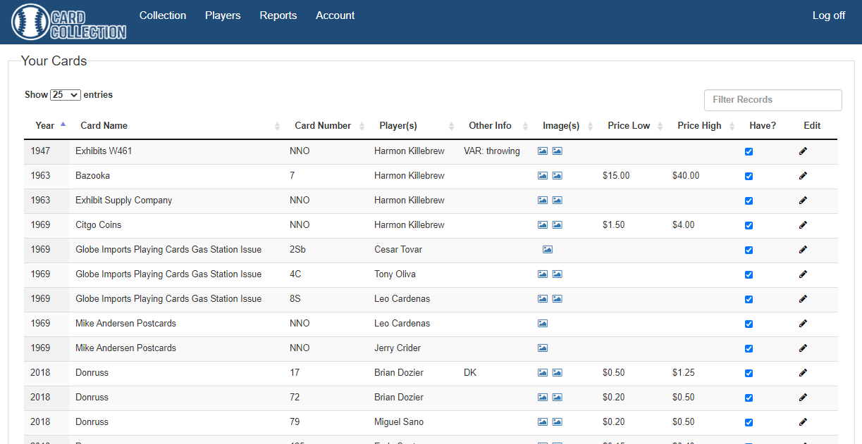Card Collection allows you to keep track of all your baseball cards you have collected over the years. Run reports to keep track of team sets and more. You can know exactly which baseball cards you may be missing from your collection, so you can find them and add them to your collection. See how much your cards are projected to be worth!
