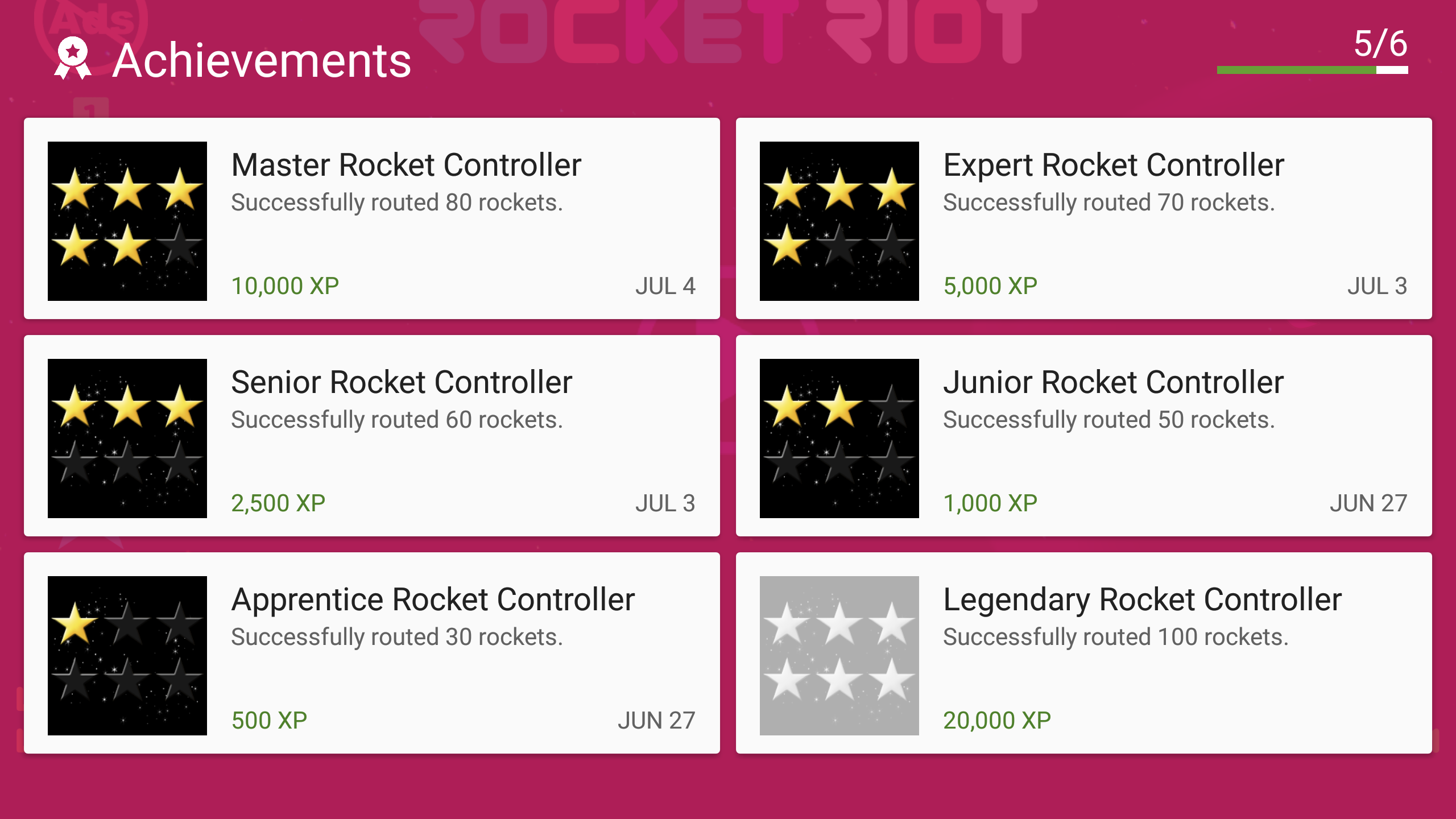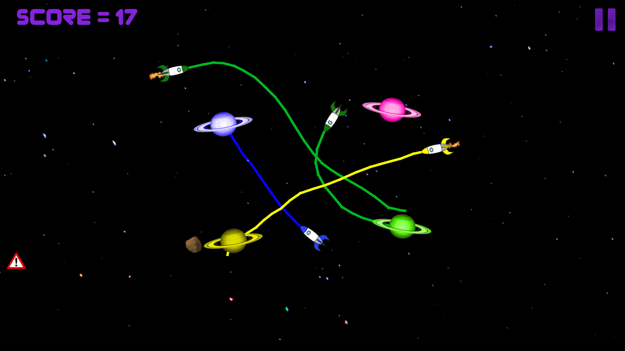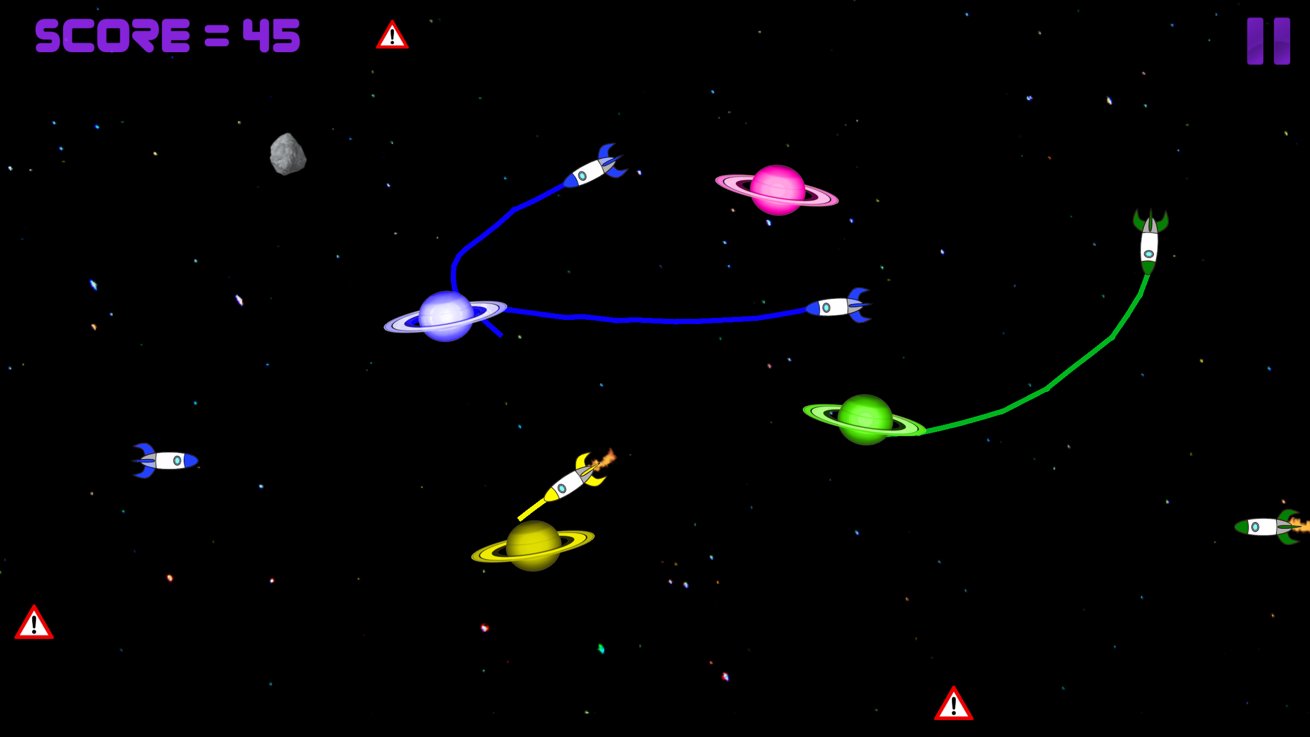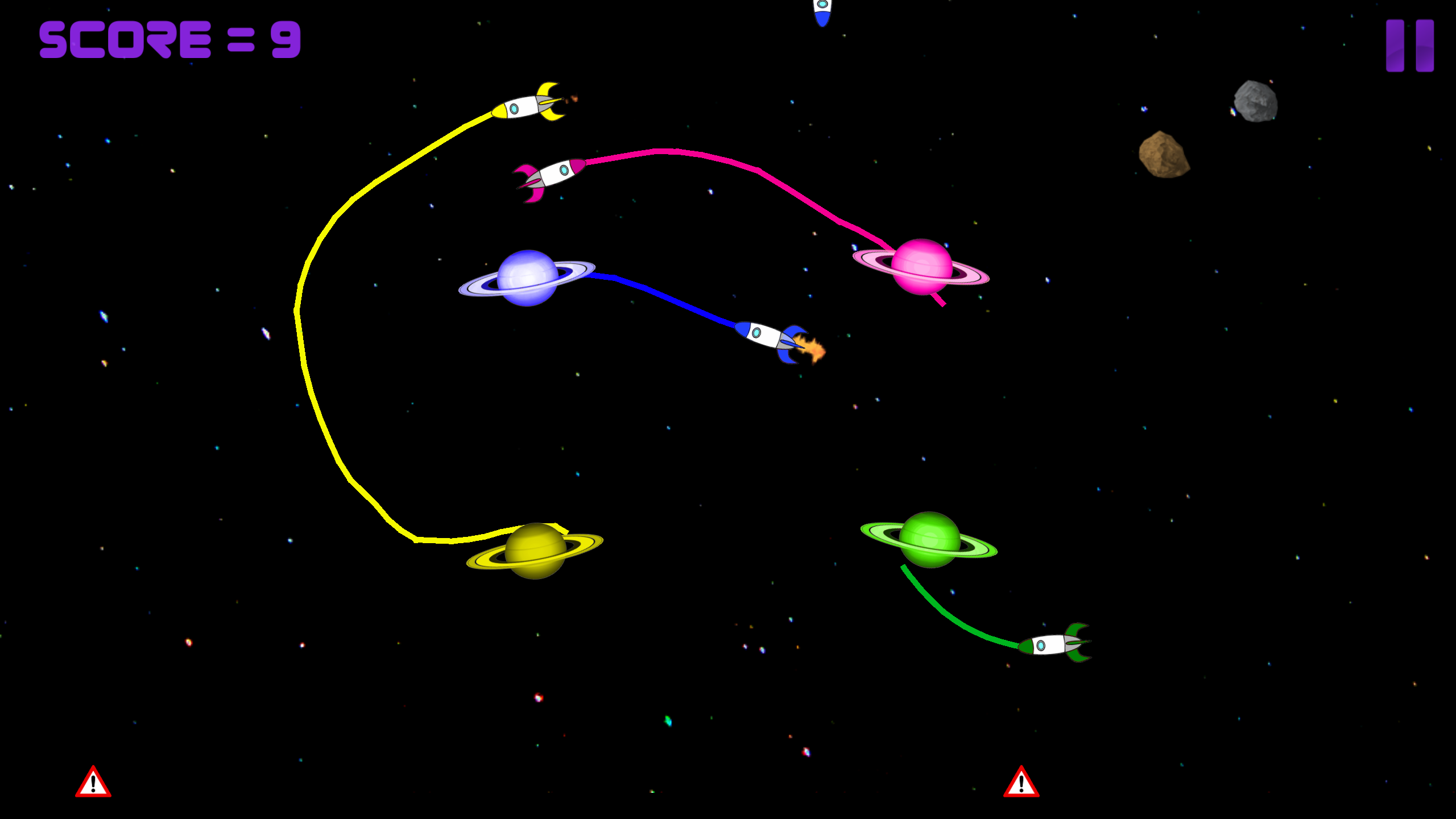 Keep the outer space safe in Rocket Riot the addictive tap and draw space game where you are the busiest space traffic controller in the Universe. In Rocket Riot you must keep the outer space safe by controlling rockets towards multi-colored planets. Simply tap on a rocket and draw a path towards a planet that matches its color. While this sounds incredibly easy (and it is), as the game progresses there are more and more rockets, rockets increasing in speed, planets rotating, and asteroids crowding the Universe. All the rocket traffic will need to be safely routed while avoiding all collisions. Rocket Riot quickly becomes a frustratingly-addictive experience as you try to beat your own and others high scores, unlock achievements, and access the online leaderboard.